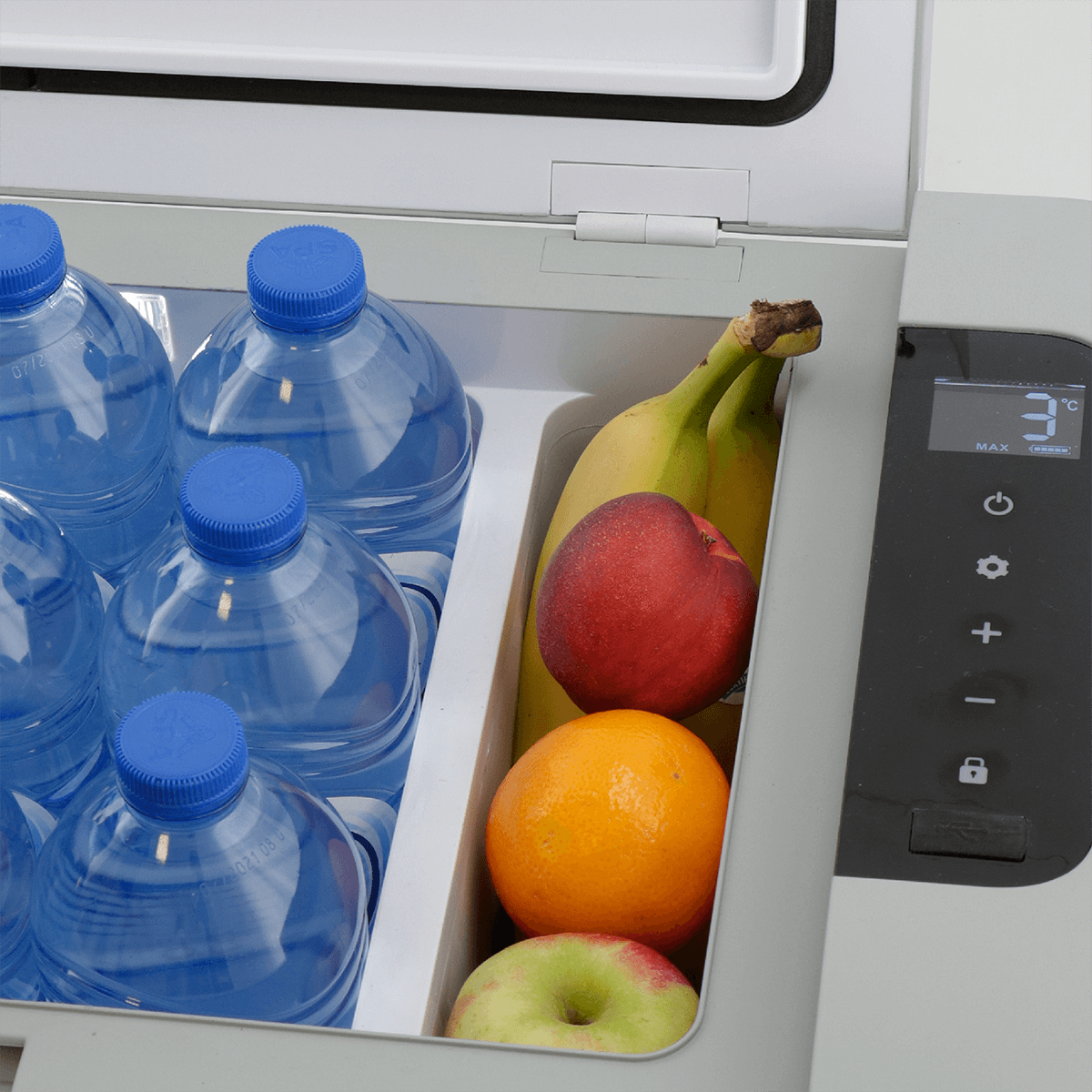 The Mestic MCC-25 offers enough space for snacks and drinks for two to three people. The cooler has a capacity of 25 liters and is suitable for 1 liter bottles. Do you prefer to keep your food and drinks separate? The compressor cooler has two compartments on the inside: one large and one smaller. The recessed handles and the weight of 12.8 kg make it easy to move the cooler from one location to another. The inside of the cooler is also equipped with lighting, so you will never be caught unprepared, even in the dark!