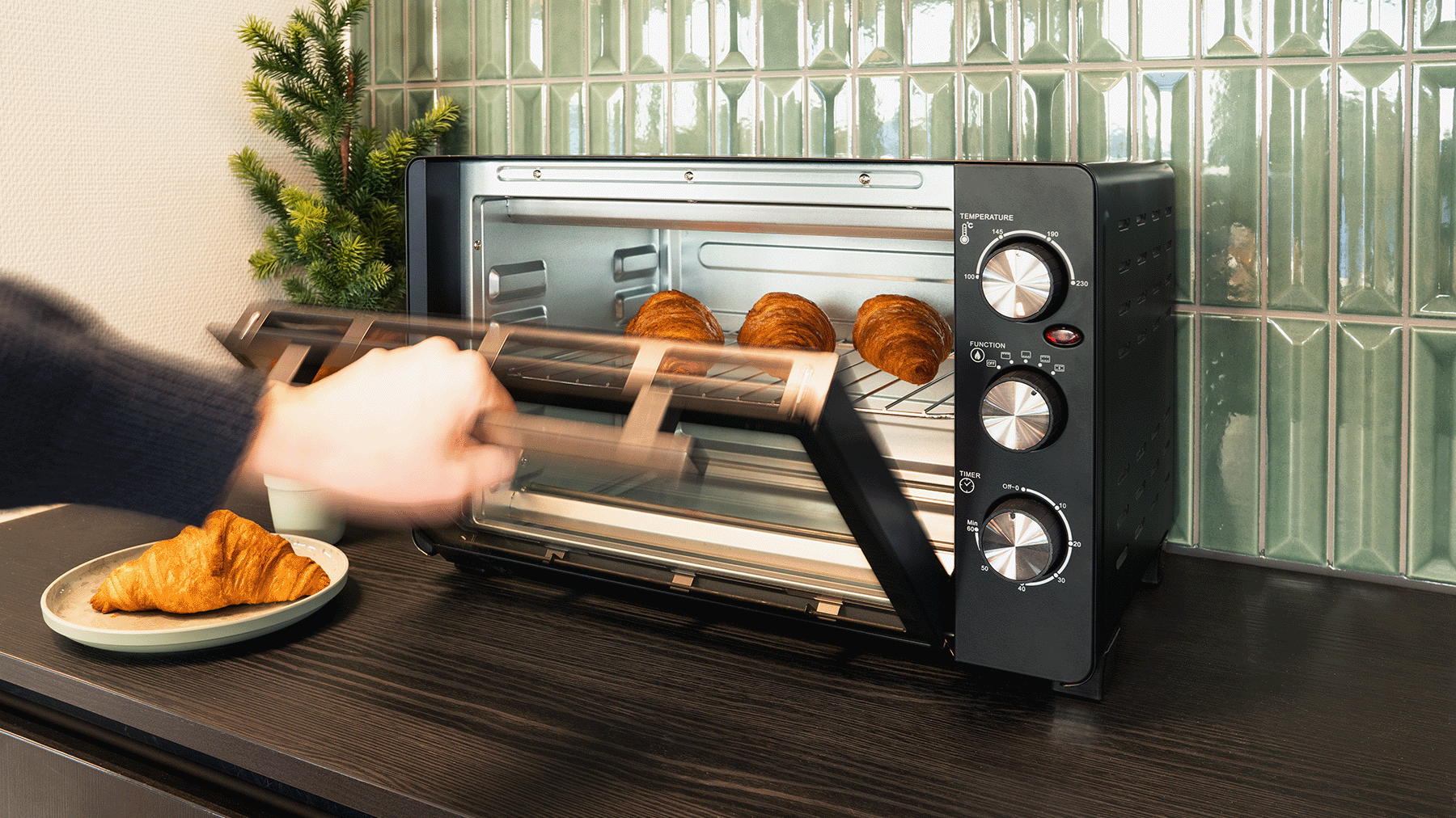 This compact convection oven will bake sandwiches and snacks, as well as full meals. You can easily set the temperature to a maximum of 230 °C. The built-in timer of up to 60 minutes lets you know exactly when the food is ready.