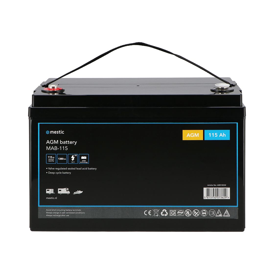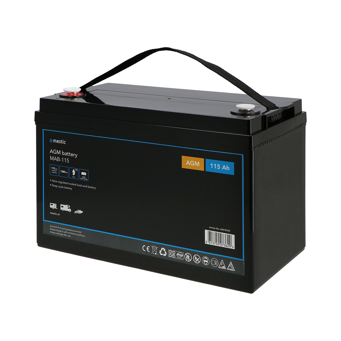 Mestic has traditional AGM battery’s with different capacities. The AGM battery (Absorption Glass Mat) is a maintenance-free battery and is very suitable as an on-board battery in the camper or caravan. This maintenance-free battery never needs to be topped up! However, it must be charged with a charger suitable for this type of batteries. A great advantage of a good quality maintenance-free battery: a long service life is guaranteed. Do you not use the battery for a longer time? Then we recommend charging it ééonce every three months to enjoy the full life of the battery. A sealed battery has other advantages. Minimal gas formation occurs, virtually eliminating explosions, the battery plates are protected from vibration and shock, and no battery acid is released if damaged or tipped over.