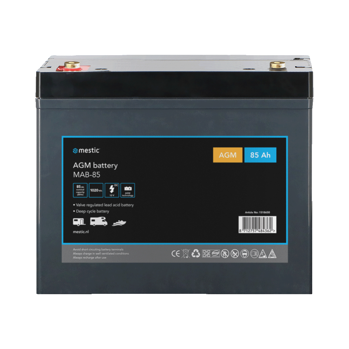 Mestic has traditional AGM batteries of different capacities. The AGM battery (Absorption Glass Mat) is a maintenance-free battery and is very suitable as an on-board battery in your motorhome or caravan. So this maintenance-free battery never needs refilling! However, it must be charged with a charger suitable for these types of batteries. A big advantage of a high-quality maintenance-free battery is that a long life is guaranteed. Not using the battery for a longer period of time? Then we recommend charging it once every three months to enjoy the full life of the battery. A sealed battery has further advantages. Minimal gas formation occurs, virtually eliminating explosions, the battery plates are protected from vibration and shock, and no battery acid is released in case of damage or tipping over.