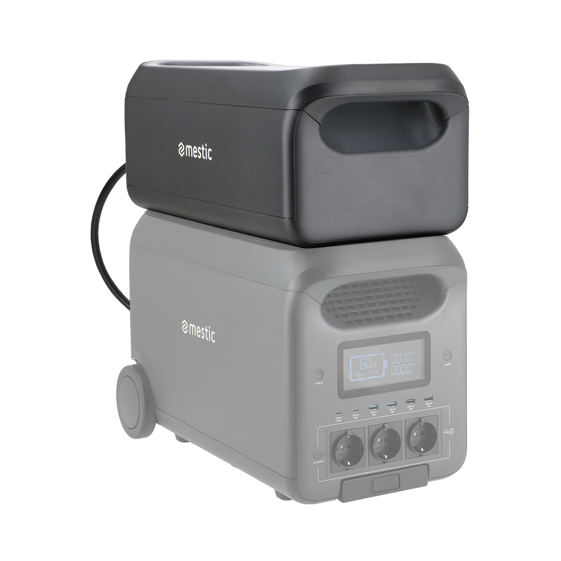 The Expansion Battery Pack MBP-3000 has an output of 2500 W. It also features a DC connection that allows you to easily connect it to the power station. Thanks to the LiFePO4 battery, it retains 80+% of its original battery capacity after many years of regular use and 4000 cycles. You simply place the Expansion Pack on or under your current power station. Note: the battery can only be combined with the Mestic Power Station MPS-3000.