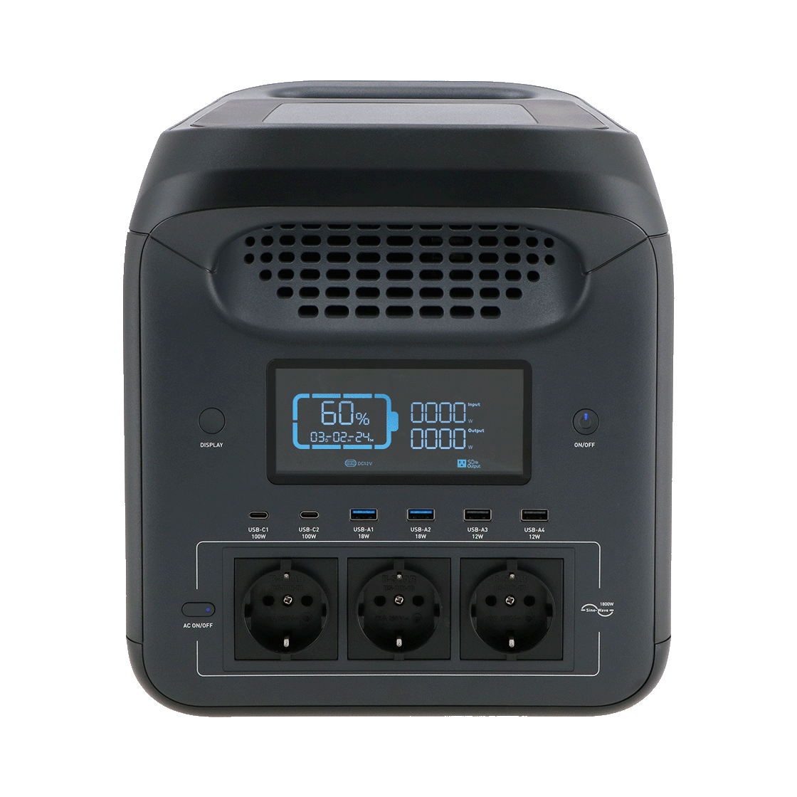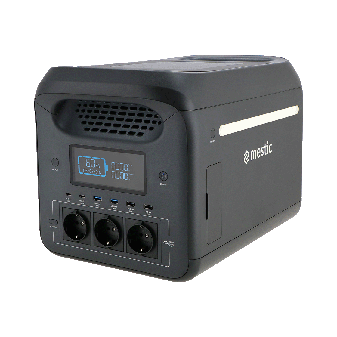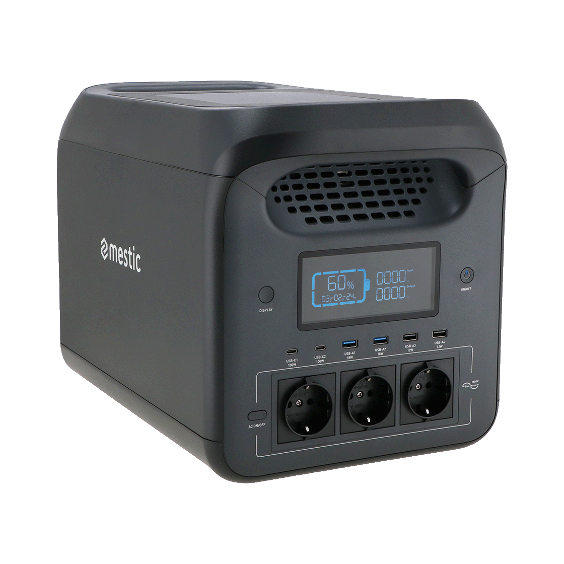 The MPS-1800 is a powerful power source with an output of 1800 W. This will give you hours of power for using everyday devices. This makes the power station extremely useful for an off-grid camping holiday. It features several output connections (AC/DC/USB-A/USB-C), so you can easily connect a phone or tablet, but also things like a coffee machine or other household items Thanks to the LiFePO4 battery, it retains 80+% of its original battery capacity after many years of regular use and 3000 cycles. You easily control this power station via the Mestic app.